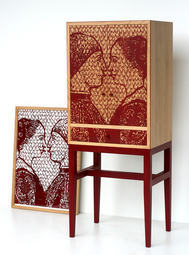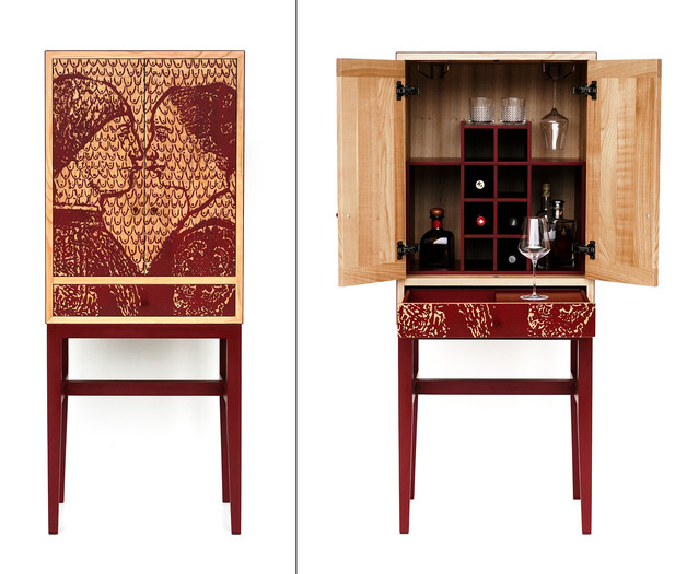 Delicate, almost skin color of the cherry cabinet is supplemented by the tall legs in velvety red, and the wood panel is embossed with red. On it there is a hand-carved image of a couple, depicted in the Renaissance spirit. Man and woman playfully, almost vulgarly show tongues to each other after experiencing in vino veritas. The motif illustrates the authentic, slightly raw human nature that we so fondly hide behind friendly faces today. The turning point happens when we open the door: that is when the couple separate and their gesture becomes intended for the people in the room. Many breasts that have been accompanying Artemis (the goddess of fertility, nature, growth and hunting) since the Greek times, remind us of our origin. They invigorate the surface and deepen the sensation. In a subtle way the taste of wine is emphasized.