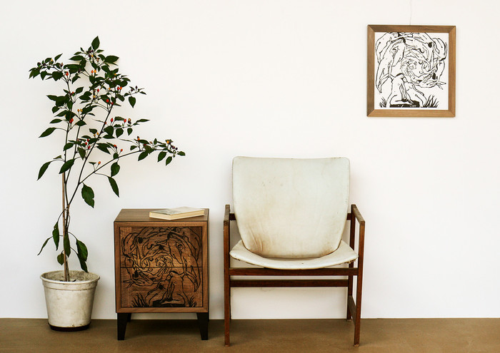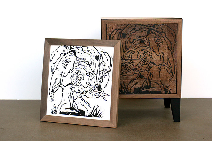 Chest of drawers in walnut solid wood. Clean and simplistic, 45 degree corner design. 2 drawers are plywood in black colour. High wooden legs in colour stained.