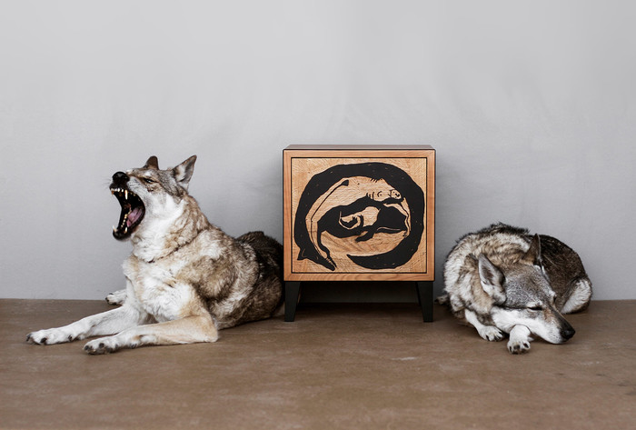Nightstand in cherry solid wood with 1 drawer and 1 shelf inside. Clean and simplistic, 45 degree corner design The nightstand offers storage for small spaces. Inner drawers are plywood in black colour. Wooden legs in colour stained.